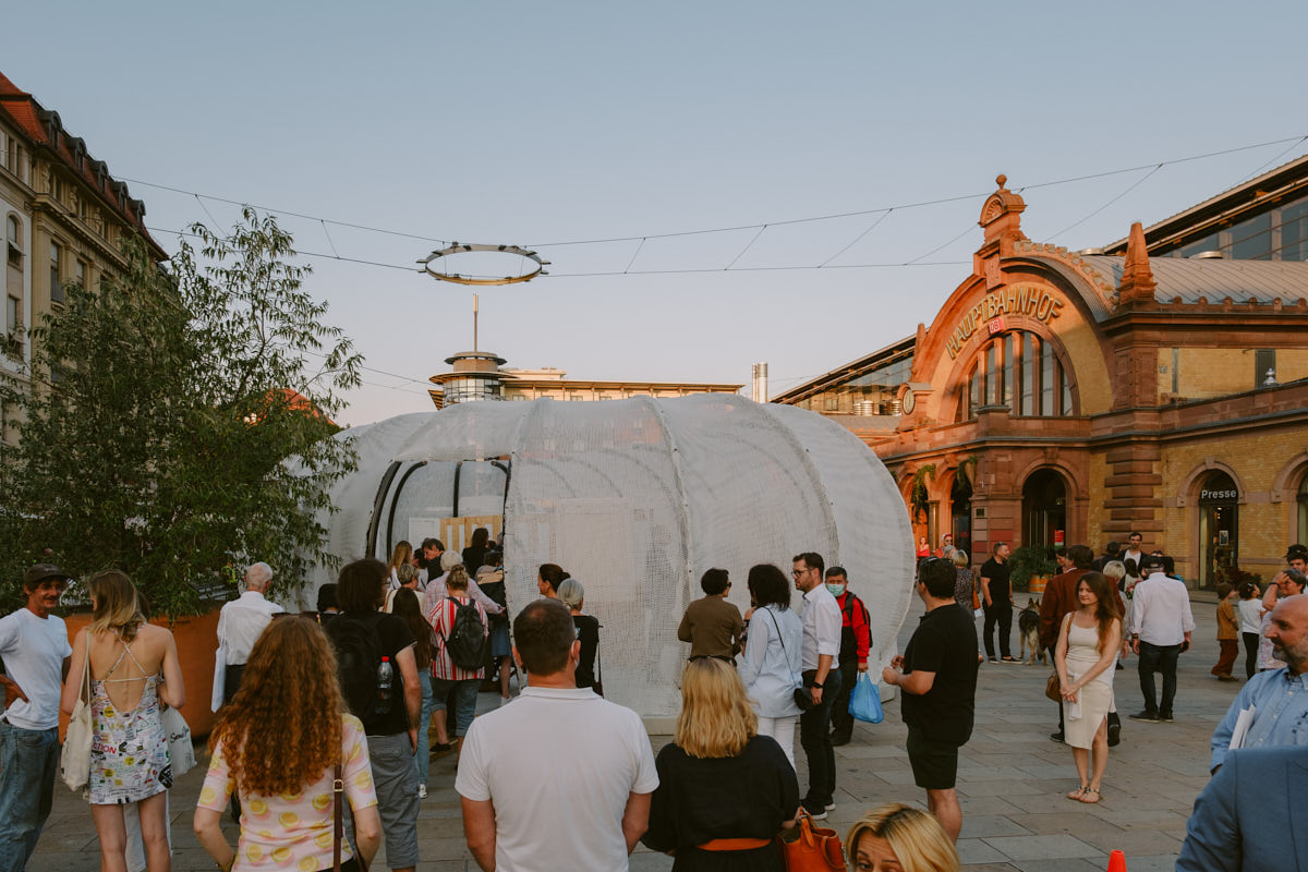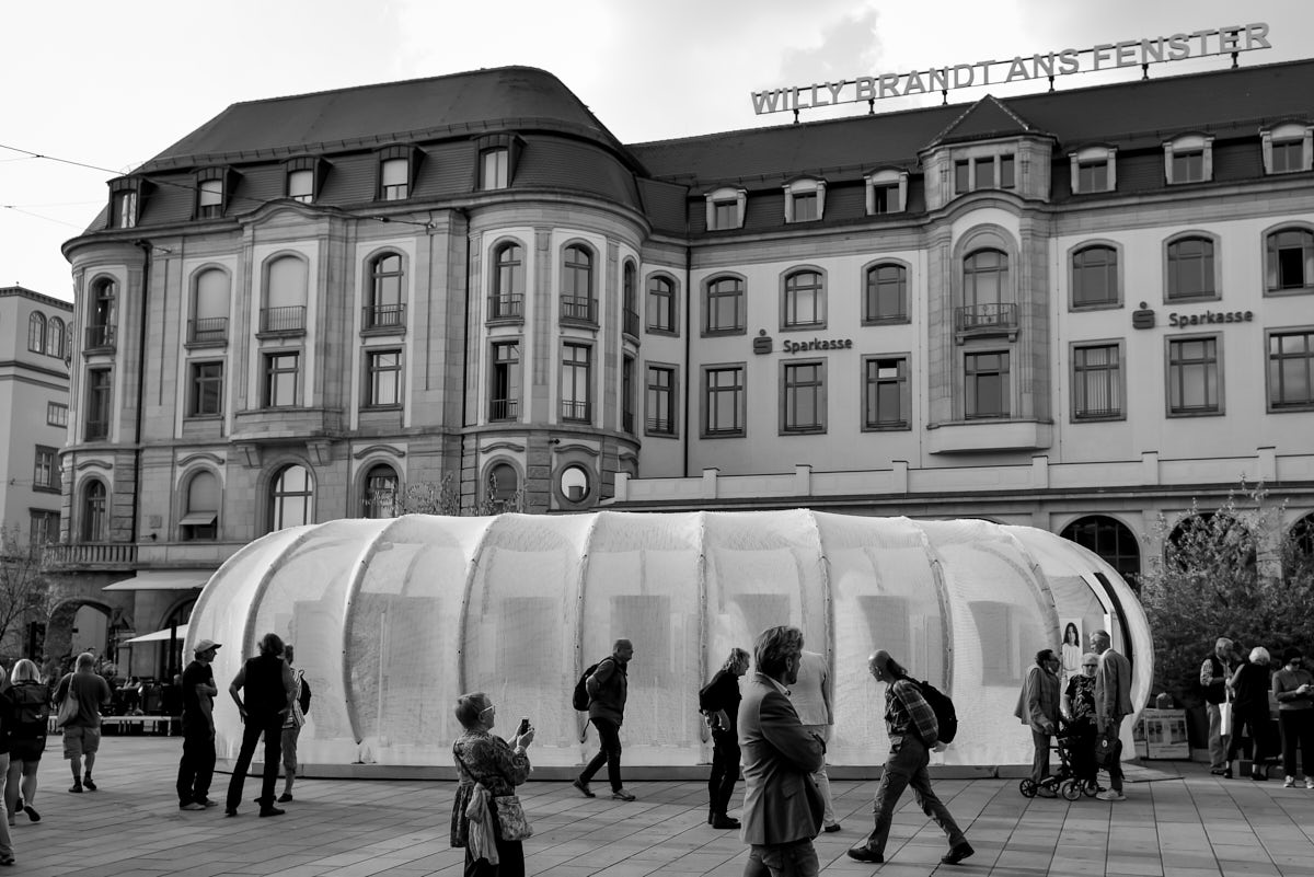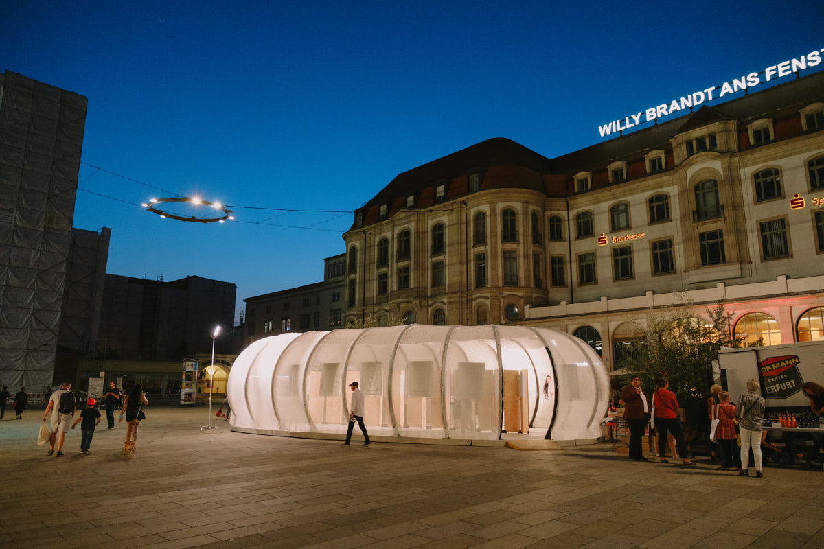 Das Projekt DER WEIßE FADEN kann in zwei unterschiedlichen Präsentationsformen realisiert werden: als KOKON, eine für alle zugängliche Installation für den öffentlichen Raum, sowie als frei arrangierte Aufstellung im Innenraum.